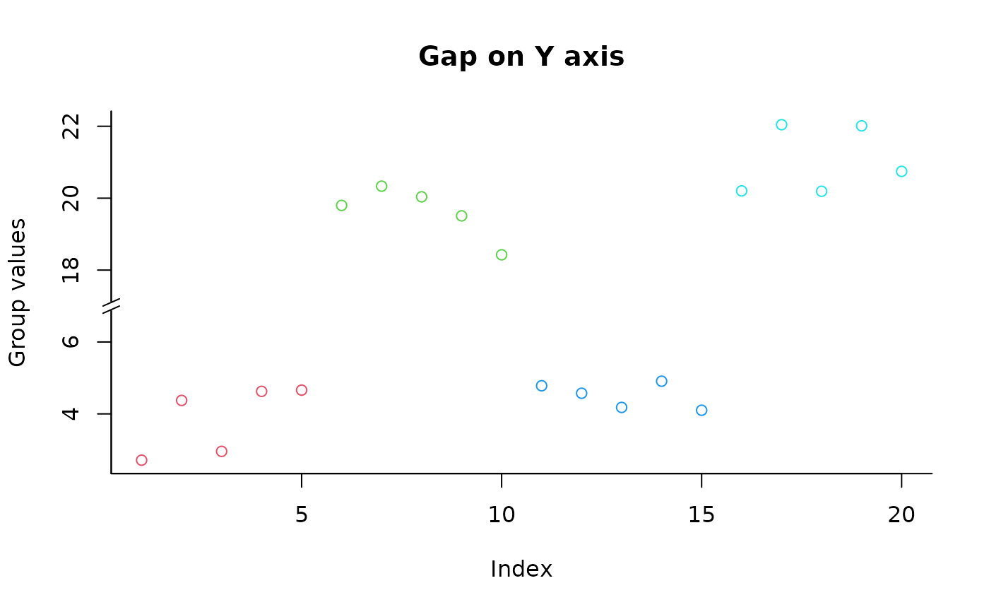 Displays a plot omitting one or two ranges of values on one axis. Typically used when there is a relatively large gap or two in the overall range of one set of values, often because of outliers. The function warns the user if any values may have been omitted by being in the "gap". See axis.break for a brief discussion of plotting on discontinuous coordinates.